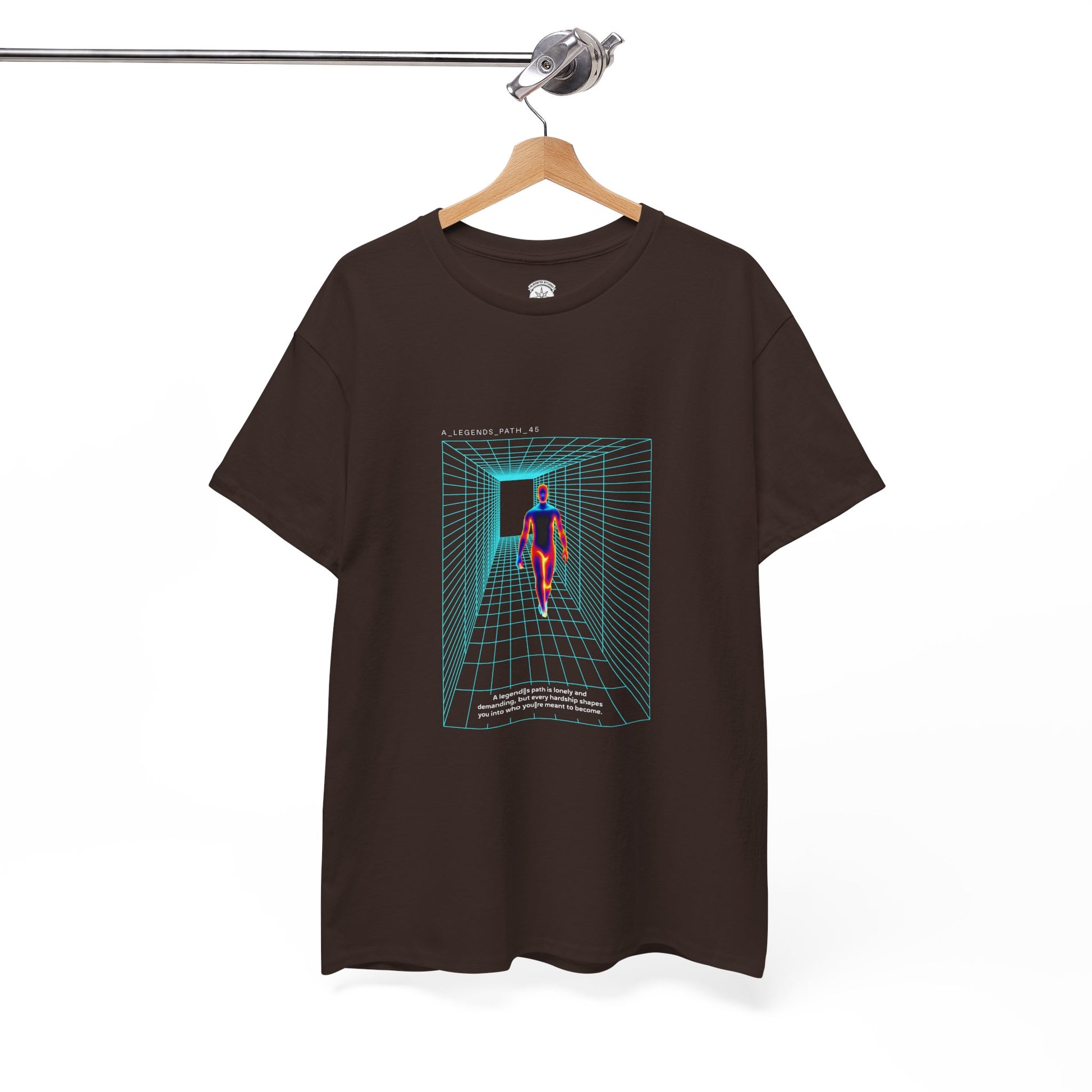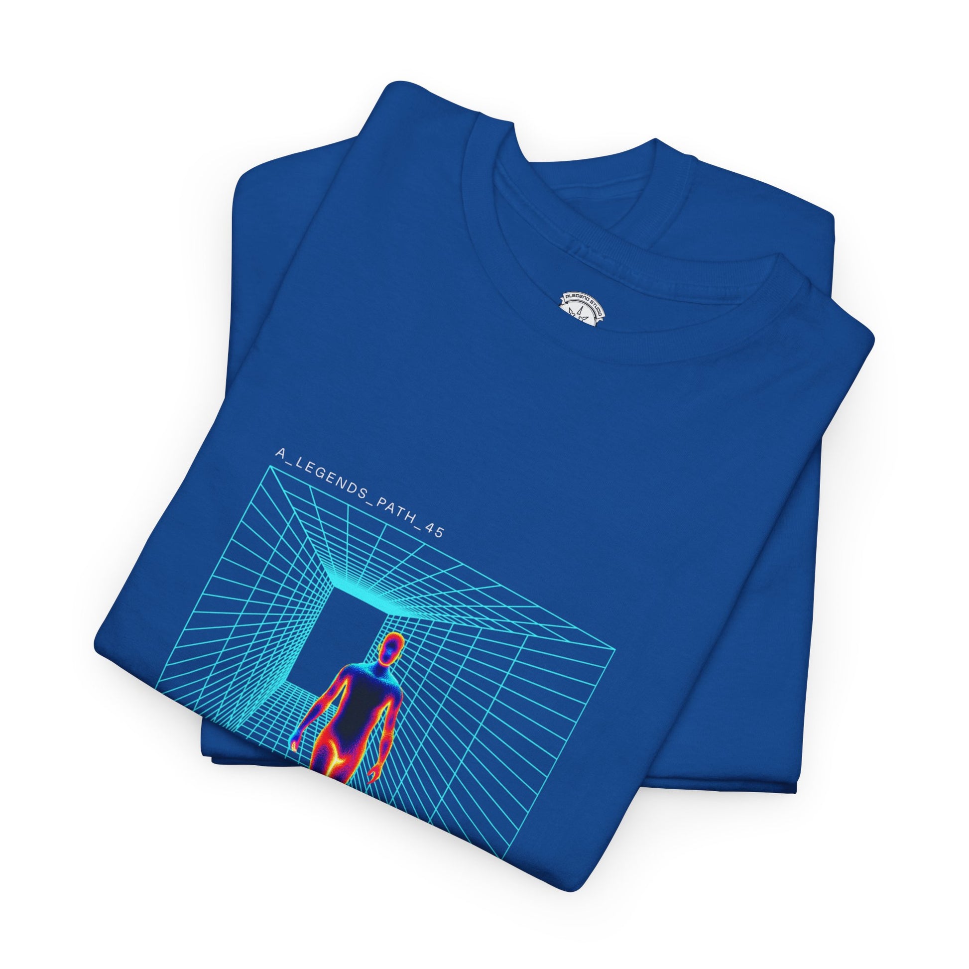 This black tee channels retro-futurist energy — a lone figure strides through a neon wireframe corridor, rendered in heat-map colors that pop against the dark background. The design feels cinematic and slightly uncanny: equal parts synthwave poster and tech-demo visualization. Wear it when you want to shift the room’s mood — it reads like a personal manifesto for late-night city walks, basement shows, or coding marathons. The medium-weight cotton holds the print crisp while the relaxed cut keeps movement easy. Subtle details like the seamless collar and tear-away label make it comfortable enough to reach for again and again.